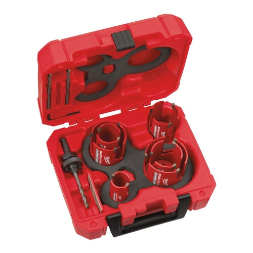 • Contents: 6 x holesaws: ⌀ 35, 44, 51, 57, 68, 76 mm. 1 x arbor with pilot drill. 2 x pilot drill. 1 x diamond file. Allen key