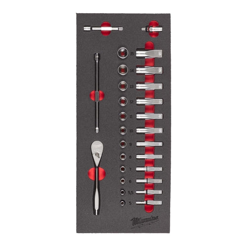• Contents: Standard sockets: 5 mm, 5.5 mm, 6 mm, 7 mm, 8 mm, 9 mm, 10 mm, 11 mm, 12 mm, 13 mm, 14 mm, 15 mm / Deep well sockets: 5 mm, 5.5 mm, 6 mm, 7 mm, 8 mm, 9 mm, 10 mm, 11 mm, 12 mm, 13 mm, 14 mm, 15 mm / 76 mm extension, 152 mm extension, universal joint