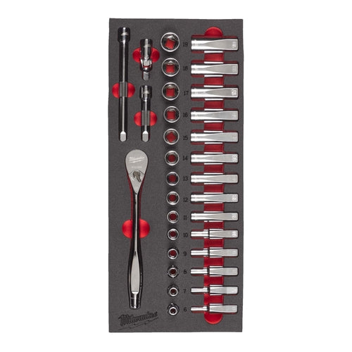 • Contents: Standard sockets: 6 mm, 7 mm, 8 mm, 9 mm, 10 mm, 11 mm, 12 mm, 13 mm, 14 mm, 15 mm, 16 mm, 17 mm, 18 mm, 19 mm / Deep well sockets: 6 mm, 7 mm, 8 mm, 9 mm, 10 mm, 11 mm, 12 mm, 13 mm, 14 mm, 15 mm, 16 mm, 17 mm, 18 mm, 19 mm / 76 mm extension, 152 mm extension / Universal joint