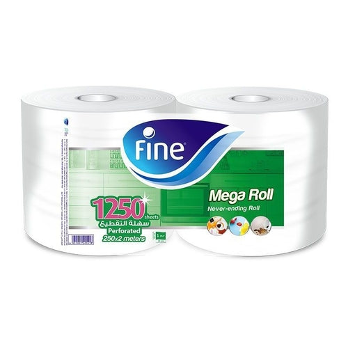 Fine Mega Roll Kitchen Paper Towels, 250m (1250 Sheets) x 1Ply, Pack of 2 Rolls