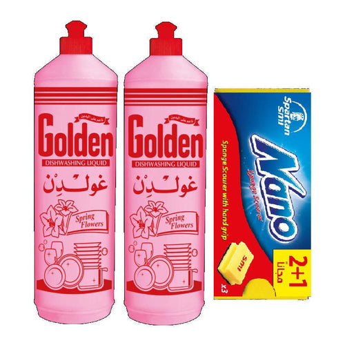 Golden Dishwashing Liquid, Spring Flowers, 1L x 2Pcs + Nano Sponge Scourer, 3Pcs