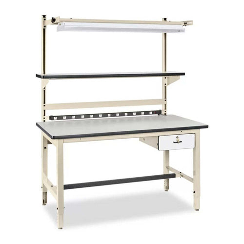 • Includes overhead fluorescent light fixture, bin holder, 12 x 60" laminate shelf, locking drawer, ground kit and 12 electrical outlets.