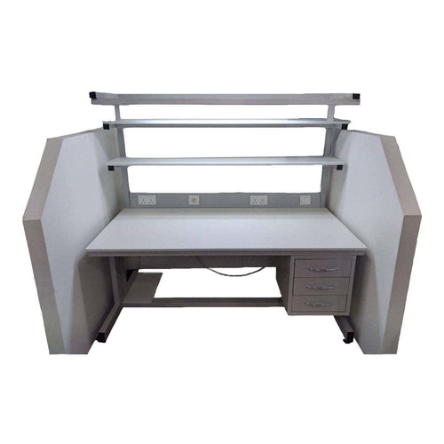 • Includes overhead 48" fluorescent light fixture, bin holder, 12 x 60" laminate shelf, locking drawer, ground kit and 8 electrical outlets.