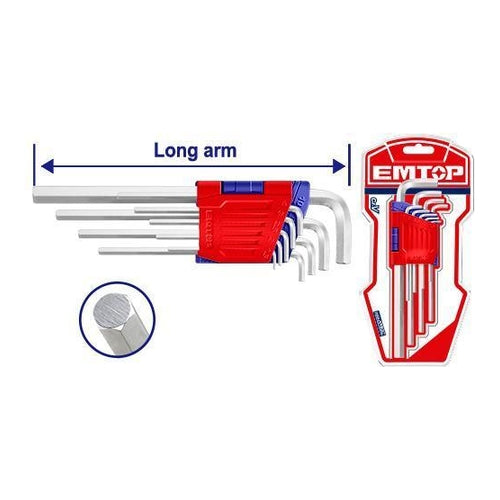 • 9pcs hex key set• Material:Cr-V• Size:1.5mm,2mm, 2.5mm, 3mm, 4mm, 5mm, 6mm, 8mm, 10mm.• Long arm• Heat treatment and chrome plate• Packed by double blister