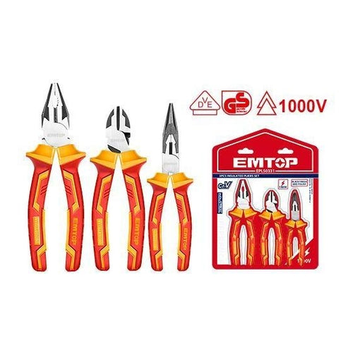 • Size: • 8" Insulated Combination pliers • 6" Insulated Long nose pliers • 6" Insulated Diagonal cutting pliers • Cr-V,black finish and polish • Two color handle • Stand high pressure:1000V • Packed by PP hanger