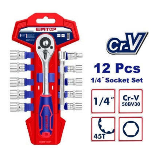 • 12 Pcs 1/4" socket set• 10 Pcs 1/4" socket:5-6-7-8-9-10-11-12-13-14mm• 1 Pcs 1/4" 45T quick release ratchet handle• 1 Pcs 1/4" 100mm extention bar• 50BV30 High quality Cr-V steel• Micro finished and chromed plated• Packed by plastic hanger