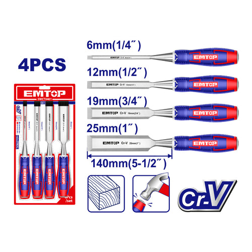 • Wood Chisel• Material:CR-V• Width:6mm,12mm,19mm,25mm• Length:140mm• Unique design handle• Packed by sliding card