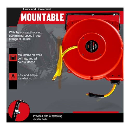 • UNIQUE FEATURES - Enclosed Spring Driven Case houses the newly designed swivel hose inlet connection protecting against leaks; the Guide System, retracts the hose orderly way w/ no pile up; 180° degree Swivel Bracket providing stable support