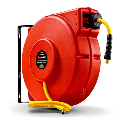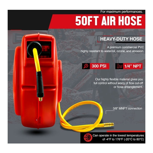 • REEL SPECS - This 3/8" inch x 50' foot reel is constructed of heavy duty impact resistant light weight Polypropylene, Premium Commercial PVC Hose working pressure 300PSI/20BAR; 1/4" inch NPT connections; (Lead-in hose 36" inches/0.9m)