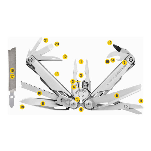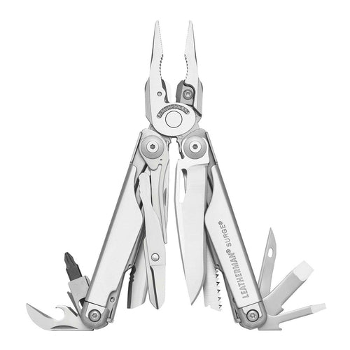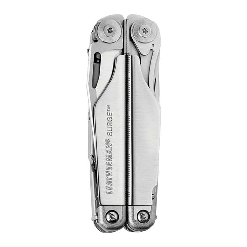 • The Leatherman Surge is one of our two largest multi-tools; a real powerhouse, built with our largest pliers, longest multi-tool blades and easy-to-use locks. A unique blade exchanger, replaceable premium wire cutters and four outside-opening blades give you quick access to the tools you use most. The Surge was built for tough jobs and the hands that do them.