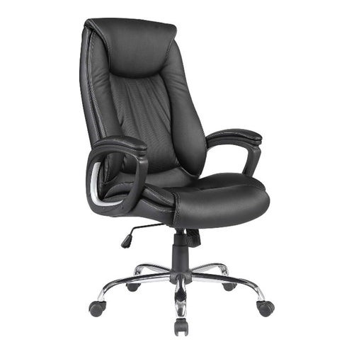 • PU Leather upholstery. • Synchronized tilting pattern. • High quality foam padding. • Fixed armrest with PU Leather upholstery. • Chrome base with 5 castors. • Height adjustment lever.