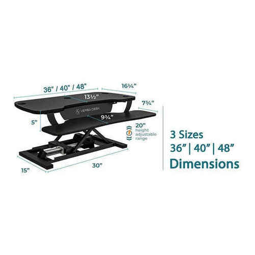 • ELECTRIC STANDING DESK CONVERTER - VERSADESK desk converter is covered by US Patent No; US 10413055 B2; Holds 80 lbs; Converts a traditional computer desk to a sit to stand desk; Fast and quiet desk height adjustment; Fully electric power without stopping points; Easily achieve the ergonomic height from 5" to 20” from table surface, ideal for home office, office working station; Monitor and monitor arm not included