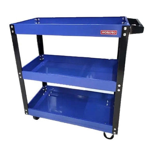 • 3-layer tool cart constructed of sturdy steel frame with wheels for easy mobility.